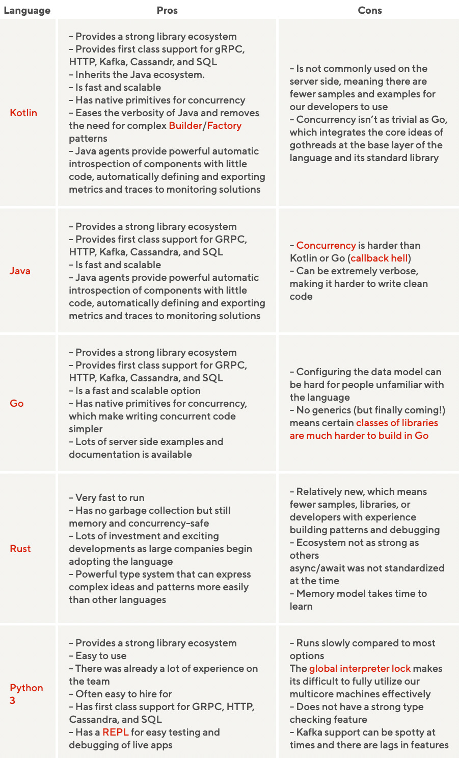 They considered the pros/cons of Kotlin, Java, Go, Rust and Python 3. They picked Kotlin.