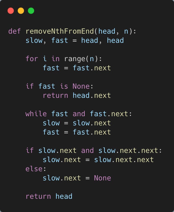 Otherwise, we’ll start traversing both the slow and fast pointer through our linked list. The fast pointer will be N nodes ahead of the slow pointer.