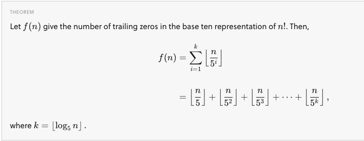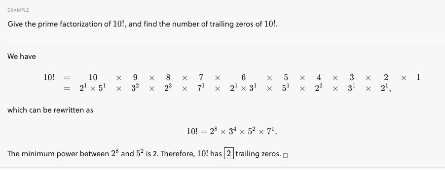 A really cool way of counting the number of 5s in the prime factorization of n! is with a simple summation as illustrated in this theorem.